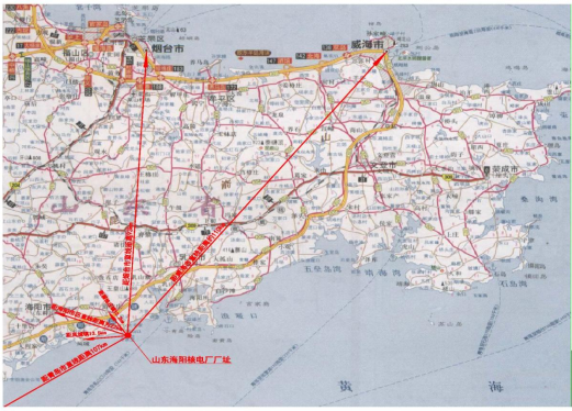 廠址距海陽市核電裝備制造工業(yè)區(qū)管委會約4.0km(廠址N方位);距留格莊鎮(zhèn)約10.2km(廠址NW方位);距鳳城街道辦事處約13.5km(廠址W方位);距海陽市市區(qū)(海陽市政府)直線距離約22km(廠址NW方位);距煙臺市直線距離約93km(廠址N方位);距青島市直線距離約103km(廠址SW方位),距威海市直線距離約110km(廠址NE方位)。