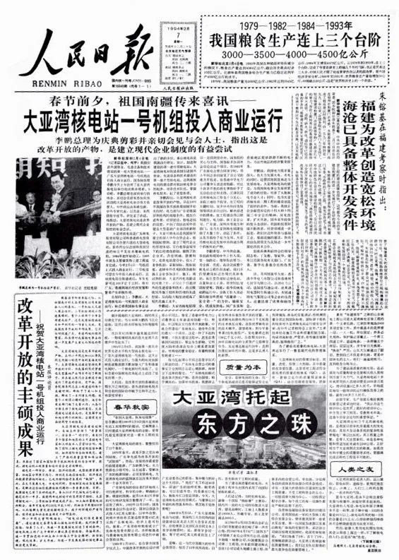 ▲1994年2月7日,大亞灣一號機組商運的新聞登上了《人民日報》頭版頭條。