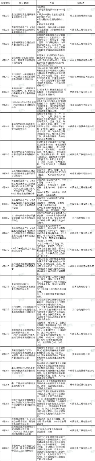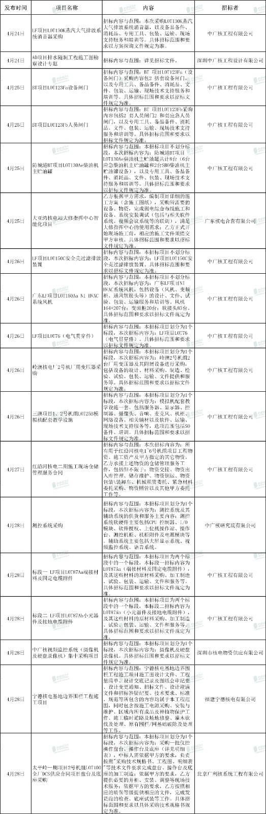以下是近期中核集團、中國廣核集團發布的核電項目招標信息匯總: