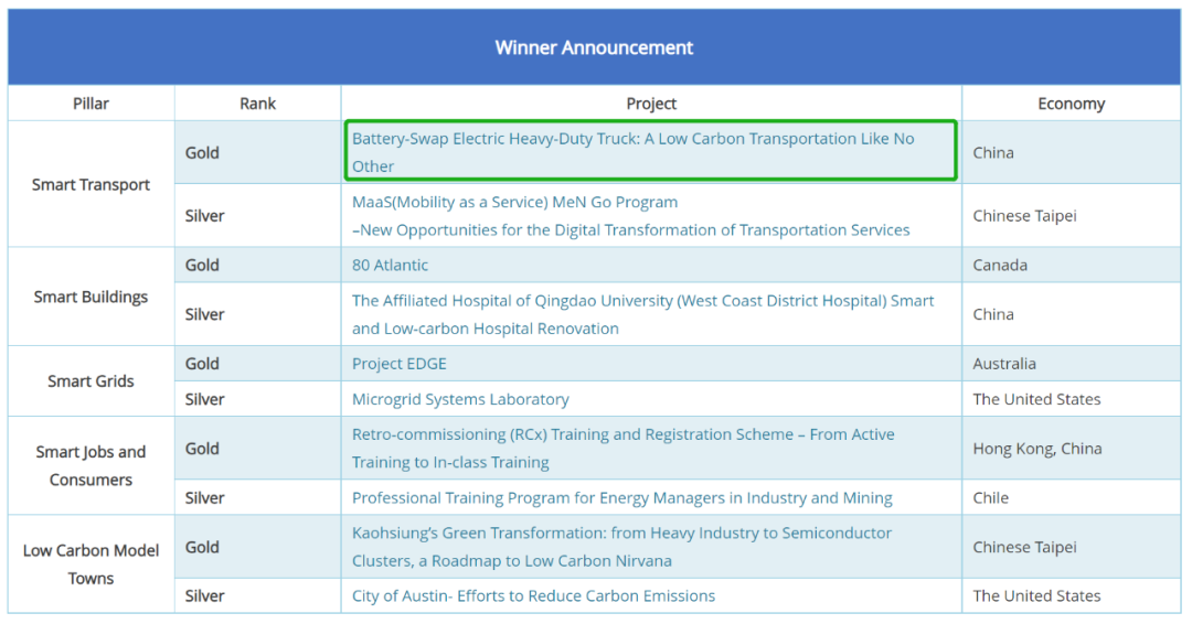 橫跨大半個地球,經過近五個月的角逐,第五屆 APEC ESCI 最佳實踐獎結果終于揭曉:國家電投“換電重卡 一 正在推動中國重型卡車運輸的智慧低碳轉型”(Battery-Swap Electric Heavy-Duty Truck:A Low Carbon Transportation Like No Other) 項目從來自澳大利亞、加拿大、美國等17個經濟體的65個項目中脫穎而出,一舉榮獲智慧交通金獎。