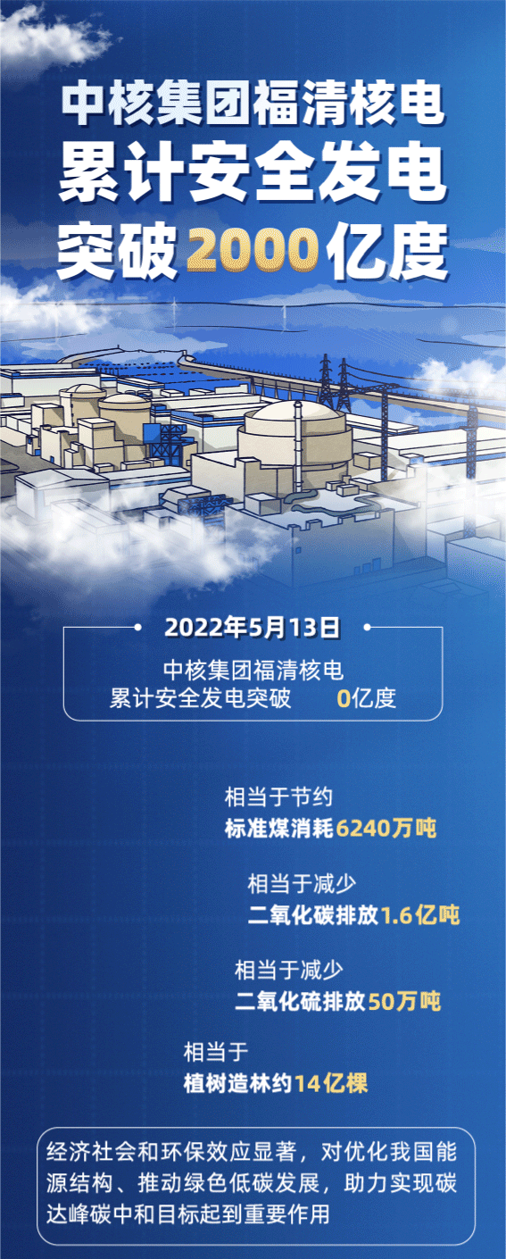5月13日,中核集團中國核電旗下福清核電累計安全發(fā)電2000億度,相當(dāng)于累計節(jié)約標準煤消耗6240萬噸,減少二氧化碳排放1.6億噸,減少二氧化硫排放50萬噸,植樹造林約14億棵,經(jīng)濟社會和環(huán)保效應(yīng)顯著,對優(yōu)化我國能源結(jié)構(gòu)、推動綠色低碳發(fā)展,助力實現(xiàn)碳達峰碳中和目標起到重要作用。