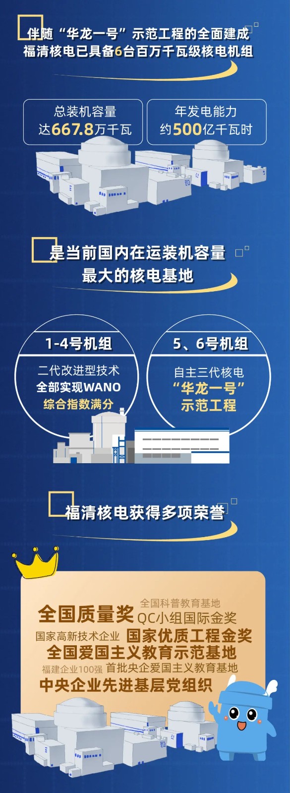 近年來,福清核電先后榮獲全國質(zhì)量獎、國家優(yōu)質(zhì)工程金獎、中央企業(yè)先進基層黨組織、國家高新技術(shù)企業(yè)、全國愛國主義教育示范基地、首批央企愛國主義教育基地、福建企業(yè)100強等多項殊榮。