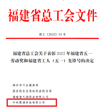 近日,福建省總工會發(fā)文表彰了2022年福建省五一勞動獎和福建省工人(五一)先鋒號,中核霞浦核電有限公司榮獲福建省五一勞動獎狀!