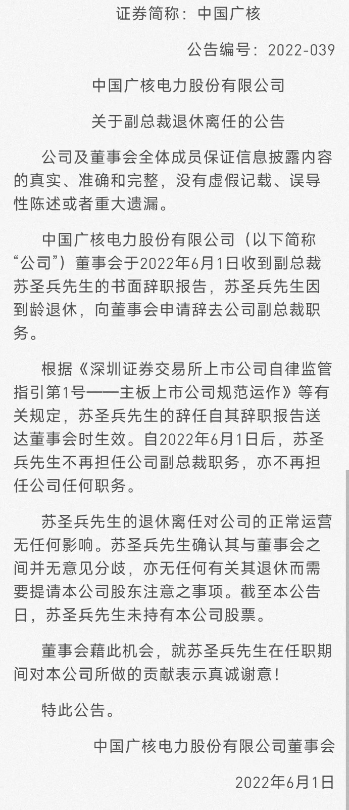 據(jù)公開消息顯示,2022年6月2日中國廣核發(fā)布關(guān)于副總裁退休離任的公告,中國廣核電力股份有限公司(以下簡稱“公司”)董事會于2022年6月1日收到副總裁蘇圣兵先生的書面辭職報告,蘇圣兵先生因到齡退休,向董事會申請辭去公司副總裁職務(wù)。
