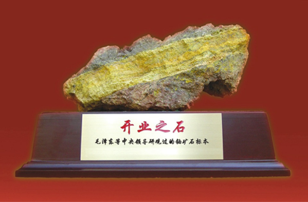 1954年,這塊鈾礦石在廣西壯族自治區(qū)被發(fā)現(xiàn)。1955年1月,它被帶往北京,出現(xiàn)在中共中央書記處專門研究我國(guó)發(fā)展原子能事業(yè)的擴(kuò)大會(huì)議上。當(dāng)聽到用于測(cè)量放射性的蓋革計(jì)數(shù)器靠近該礦石發(fā)出“嘎嘎”的響聲時(shí),與會(huì)的中央領(lǐng)導(dǎo)人均感到十分振奮。