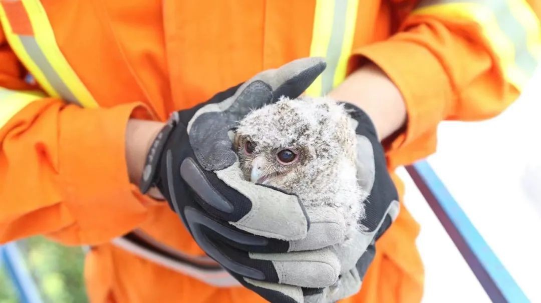 消防員救助三門核電廠區國家二級保護動物貓頭鷹雛鳥