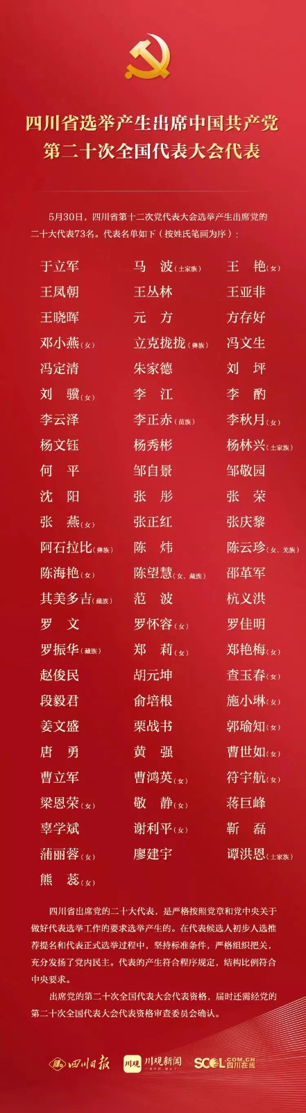 四川省出席黨的二十大代表,是嚴格按照黨章和黨中央關于做好代表選舉工作的要求選舉產生的。在代表候選人初步人選推薦提名和代表正式選舉過程中,堅持標準條件,嚴格組織把關,充分發揚了黨內民主。代表的產生符合程序規定,結構比例符合中央要求。