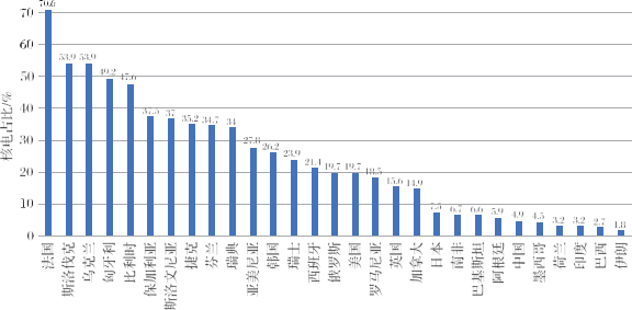 2019 年,世界核發電約占總發電量的 10.35%。其中,有 19 個國家的核電占比超過了 10% 的全球平均水平(見圖 2)。除了荷蘭、日本,具有核電機組的發達國家的核電占比都超過了全球平均水平,發展中國家的核電占比相對較小。日本在福島核事故后,由于核電站停運數量較多,所以核發電占比降低。