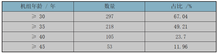 3機組老齡化是在運機組面臨的重要問題,機組延壽或退役是世界核電未來發展的一個重要趨勢,尤其是發達國家目前,世界在運的核電機組多數是二代技術,通常設計壽命為 40 年,運行年齡超過 30 年、35 年、40 年和 45 年的機組分別有 297 臺、218 臺、105 臺和 53 臺, 分別占在運機組的 67.04%、49.21%、23.7% 和 11.96%(見表 1)。為了降低費用、保障電力安全,美國、法國、俄羅斯、加拿大等多個國家正在制定機組延壽計劃,將二代機組延壽至 50 年、60 年乃至更長的壽期。