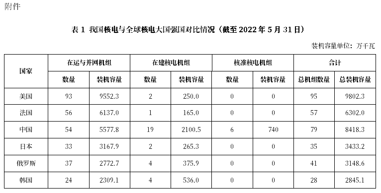截至2022年5月31日,我國(guó)在運(yùn)(投入商業(yè)運(yùn)行)、并網(wǎng)待投運(yùn)、在建、核準(zhǔn)待開工的核電機(jī)組總計(jì)79臺(tái),總裝機(jī)容量8418.3萬(wàn)千瓦。其中,在運(yùn)核電機(jī)組52臺(tái),總裝機(jī)容量5444.8萬(wàn)千瓦;實(shí)現(xiàn)首次并網(wǎng)有待商運(yùn)的核電機(jī)組2臺(tái),總裝機(jī)容量133.0萬(wàn)千瓦,分別為國(guó)家電投紅沿河核電站1的6號(hào)機(jī)組和華能集團(tuán)石島灣高溫氣冷堆核電站示范工程。因此,我國(guó)在運(yùn)和并網(wǎng)核電機(jī)組總數(shù)量為54臺(tái),總裝機(jī)容量5577.8萬(wàn)千瓦。