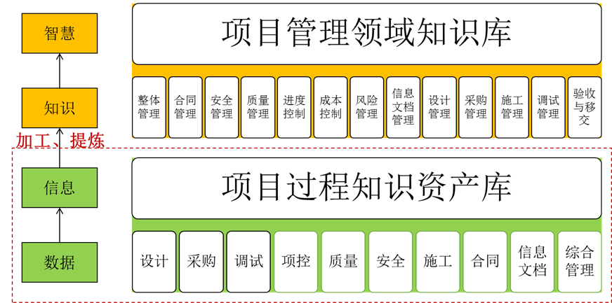 基于數據—信息—知識—智慧的知識階層,中核工程構建了兩級知識庫,項目過程知識庫注重數據、信息的存儲、整合,實現過程數據積累,消除信息孤島;領域知識庫則注重對數據、信息的加工、提煉,通過梳理業務流程體系與崗位體系,實現隱性知識顯性化。