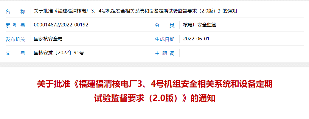 你公司《關(guān)于懇請對福建福清核電廠3、4號機組安全相關(guān)系統(tǒng)和設備定期試驗監(jiān)督要求(2.0版)進行審評的請示》(福核發(fā)〔2019〕128號)和《關(guān)于懇請批準福建福清核電廠3、4號機組安全相關(guān)系統(tǒng)和設備定期試驗監(jiān)督要求(2.0版)的請示》(福核發(fā)〔2022〕37號)收悉。