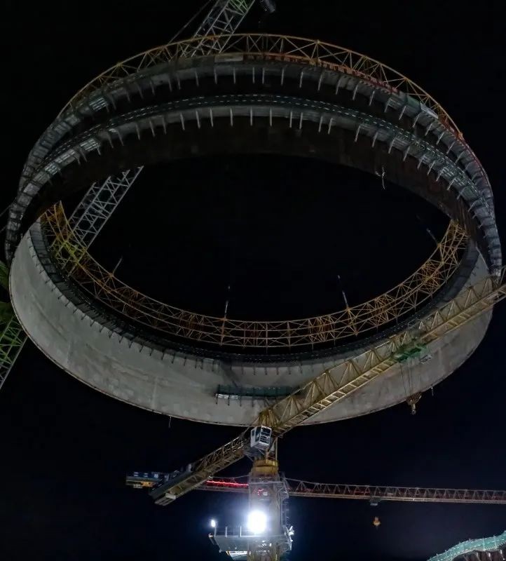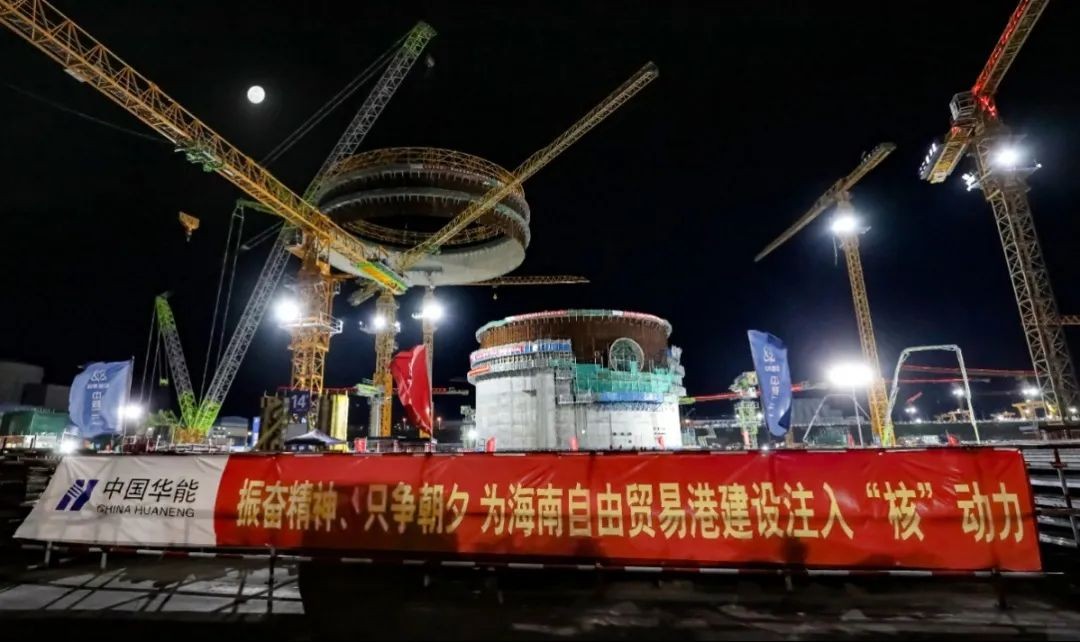 由于近期現場風力不穩定,華能海南昌江核電有限公司聯合現場各參建單位研究制定應對措施,密切關注現場風速變化情況,在做好現場夜間照明等各項準備工作的前提下,決定在6月17日晚22時35分開始模塊五的吊裝,在經過起吊、變幅、旋轉、提升、吊車行走、就位等一系列動作后,鋼襯里模塊五與模塊四精準對接。