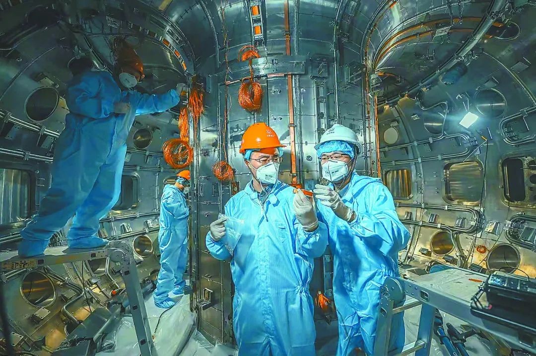 科技人員在新一代“人 造太陽(yáng)”真空室內(nèi)討論。