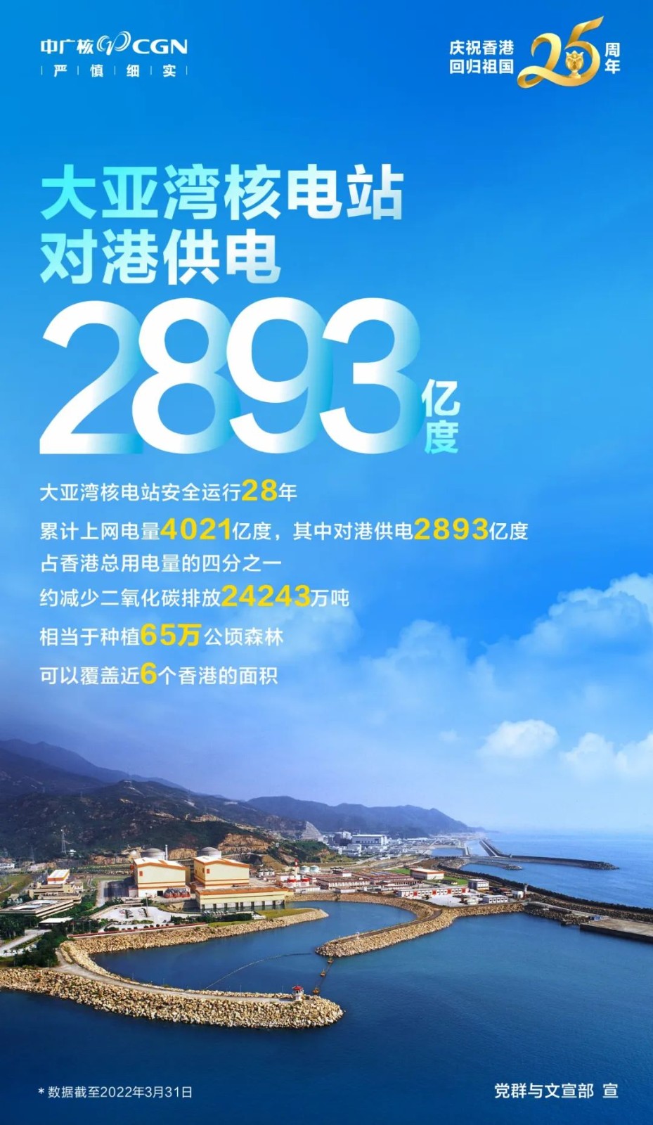截至2022年3月31日,大亞灣核電站已持續對港供電28年,供電累計達2893億度,28年來大亞灣核電站每年為香港供電超過100億度,占香港總用電量的四分之一,為滿足香港電力供應改善能源結構發揮了積極作用。