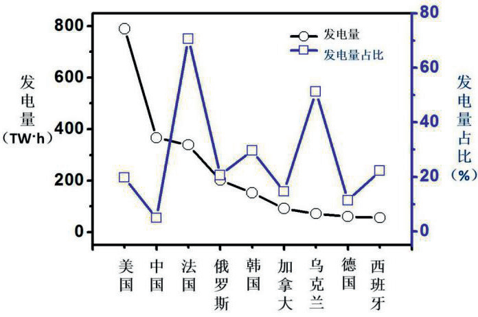 截至2020年12月31日,我國運行核電機組共49臺,裝機容量為5102萬千瓦,我國目前的裝機容量僅次于美國和法國,位列全球第三位,如圖1所示。我國目前在建機組17臺,總裝機容量1853萬千瓦,在建機組數量和裝機容量多年位居全球首位。2020年我國運行核電機組共計發電量為3662億千瓦時,世界排名第二,如圖2所示,但是我國核電發電量占比為4.97%,低于世界平均水平10%,而世界核強國法國和美國的核電占比分別為70.6%和19.7%。從核電占比角度看,與世界核強國相比,我國核電還有很大發展空間。