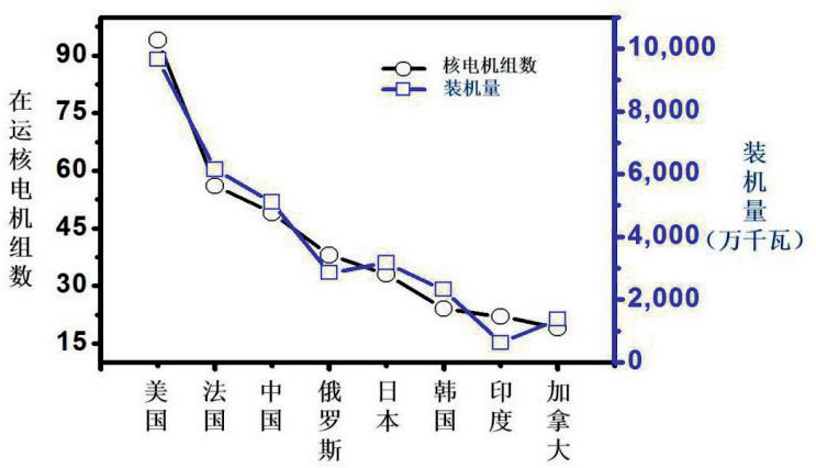 圖1 2020年世界主要核電強國在運機組數和裝機量