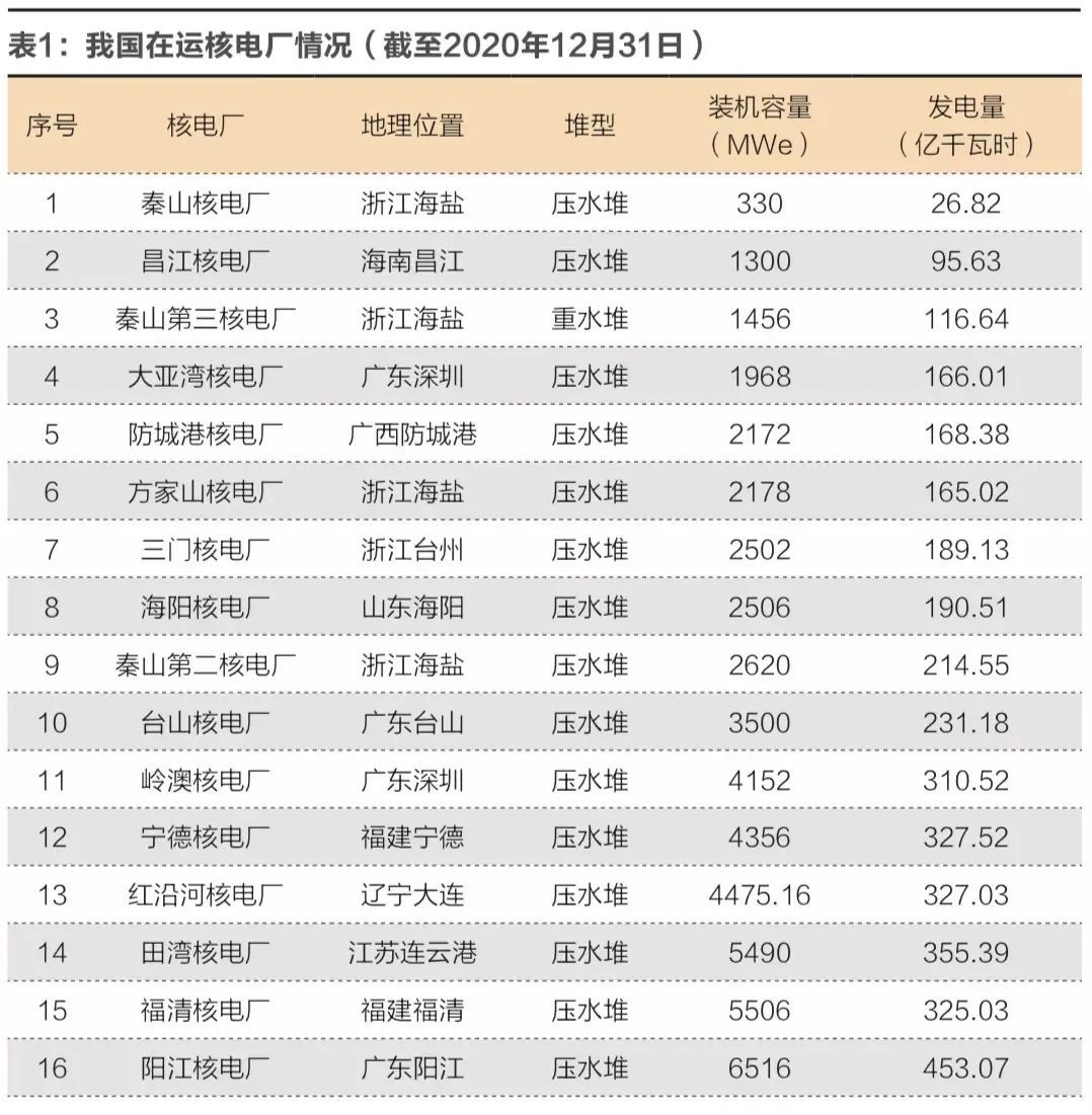 現階段我國在運核電廠共16座,全部分布在沿海地區,2020年全年運行情況詳見表1。其中華東地區有9座核電廠,裝機容量占全年總裝機容量之比為52.8%,發電量占全年總發電量之比為52.17%;華南地區共有6座核電廠,裝機容量占比為38.43%,發電量占比為38.9%;東北地區1座核電廠,裝機容量占比為8.77%,發電量占比為8.93%。我國內陸沒有核電廠在運行。