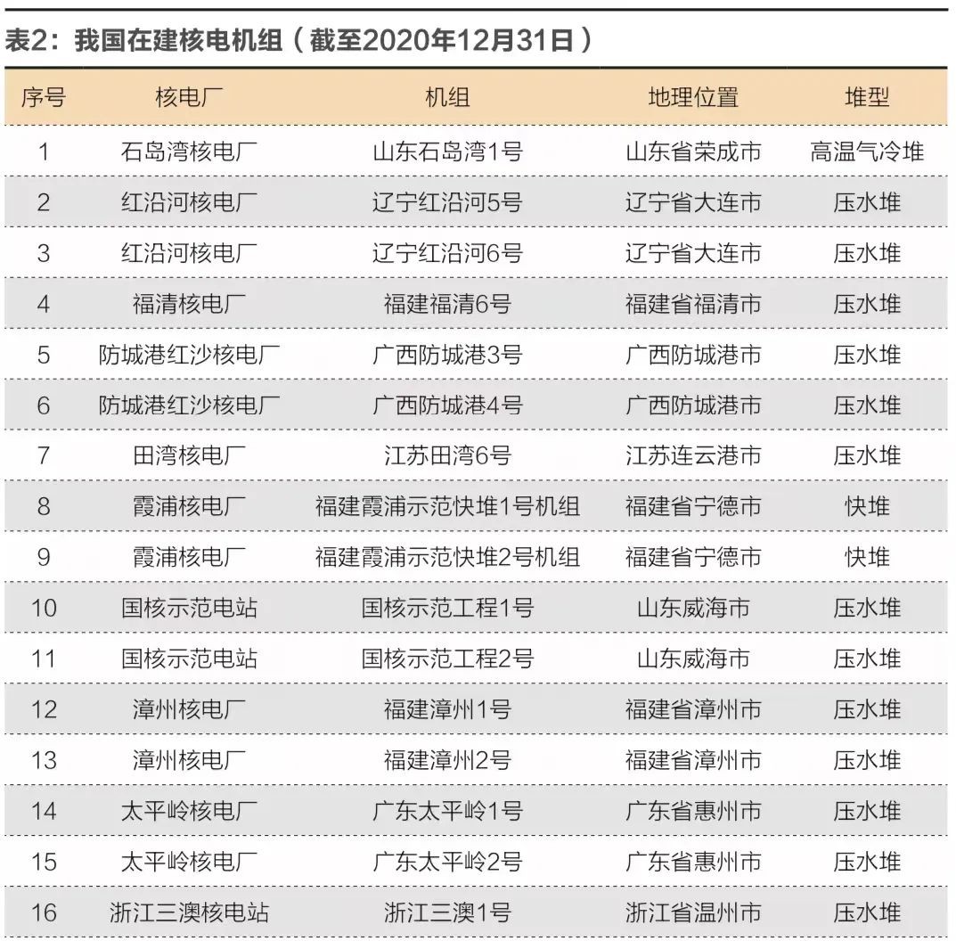 截至2020年12月31日,我國在建核電機組情況詳見表2,17臺在建核電機組全部分布在沿海地區。其中華東地區10臺核電機組,華南地區4臺核電機組,東北地區2臺核電機組。