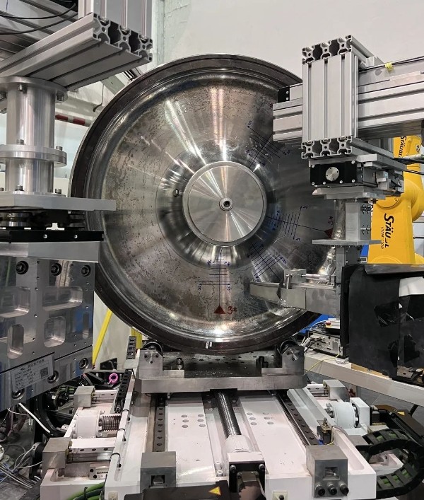 作為列車與鐵軌接觸的唯一部件,車輪是列車安全穩定運行的重要保障。車輪的殘余應力貫穿其結構設計、加工制造及服役的全壽命周期,是導致金屬疲勞的關鍵因素之一,因此對其精準評估至關重要。在此次實驗中,聯合團隊針對服役100萬公里的進口車輪和尚未服役的國產車輪,利用中國先進研究堆中子科學平臺的工程應力譜儀,充分發揮中子的深穿透優勢,完成了兩個均重逾300公斤、直徑約1米、測試深度達40余毫米的全尺寸不銹鋼高鐵車輪的殘余應力無損檢測。