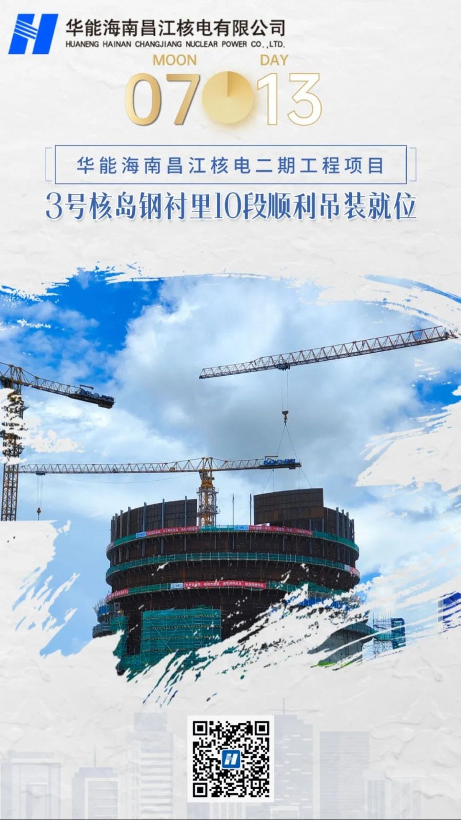 2022年7月13日12時55分,華能海南昌江核電二期工程3號核島鋼村里筒整10段鋼襯里壁板全部吊裝就位,又一重大里程碑順利實現,較計劃提前3天完成,標志著3號機組鋼襯里筒壁全部安裝就位,為后續環吊牛腿的安裝提供了有利的條件。