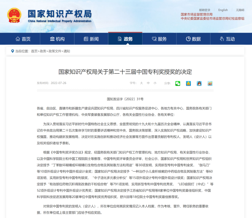 7月26日,國家知識產權局發布了《國家知識產權局關于第二十三屆中國專利獎授獎的決定》(國知發運字〔2022〕31號)。中國核動力研究設計院參評專利在本屆中國專利獎評選中表現出色,獲得一銀兩優秀三項獎項,數量創歷年新高。