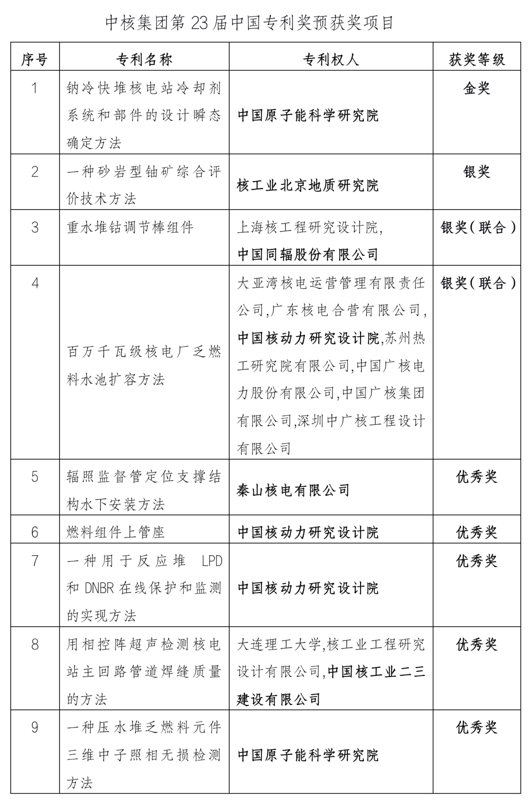 7月26日,國家知識產權局公布了關于第23屆中國專利獎授獎的決定,中核集團共9件專利獲獎,繼2021年獲得中國專利金獎后再次獲得1項金獎、3項銀獎以及5項優(yōu)秀獎,突破歷史最好成績。