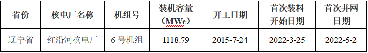 表1:2022年1-6月首次裝料的核電機組信息