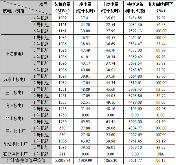 3) 本表“合計值/整體值/平均值”中,裝機容量、發電量、上網電量為各機組合計值,核電設備利用小時數為全部機組整體值,機組能力因子為全部機組的算數平均值。