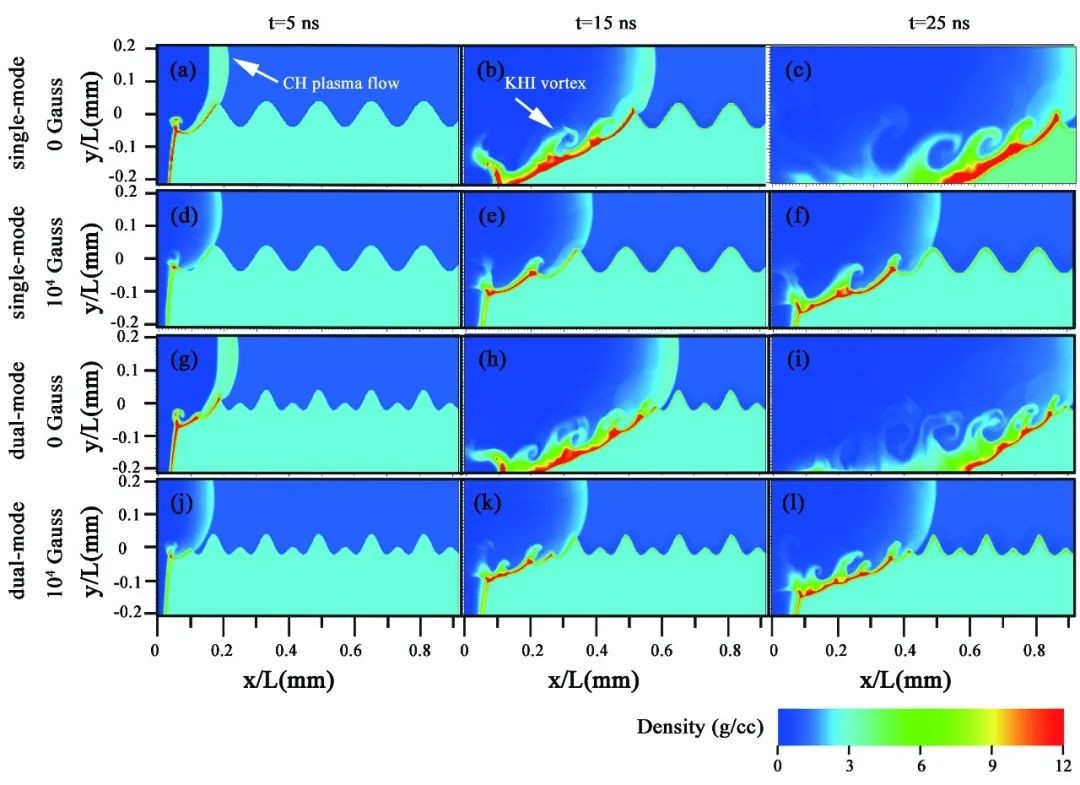 數值模擬表明,水平流向外加磁場可抑制單模KHI渦旋發展和多模KHI渦旋的并合過程,外加磁場對多模擾動KHI的演化具有更加強烈的制穩效果,在25納秒內KHI的平均增長率降低了20%。研究結果可為在強磁環境下利用強激光裝置開展KHI實驗提供理論指導,對慣性約束聚變前沿研究具有重要意義。