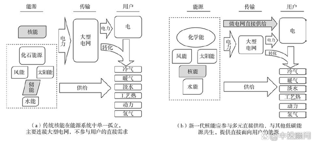隨著可再生能源份額的不斷上升,電網不穩定性問題愈發顯著。未來核能應該利用自身優勢與其他清潔能源形成一個相互促進、互為補充的共生網絡,通過與其他低碳能源的聯合,共同向大型電網進行傳輸,以此滿足較大區域的穩定供電需求。同時,在能源供給路徑中,核能也要逐步向用戶端靠近,簡化能源傳輸和分配路徑,實現直接參與用戶供給,減少對于化學能的依賴。