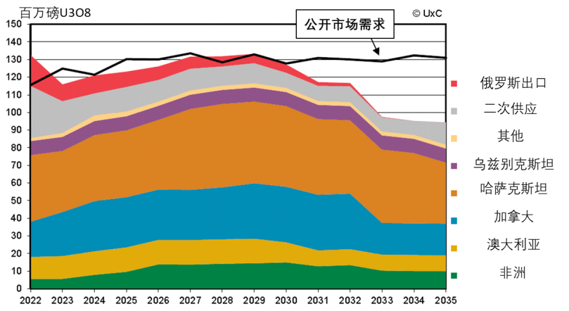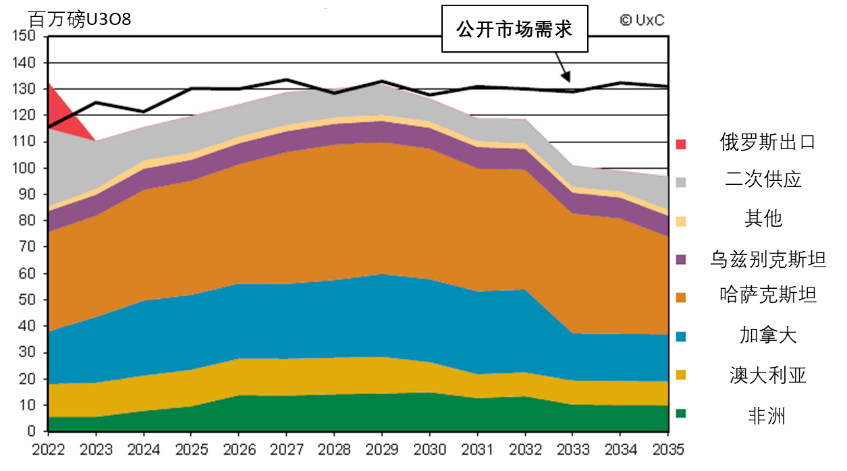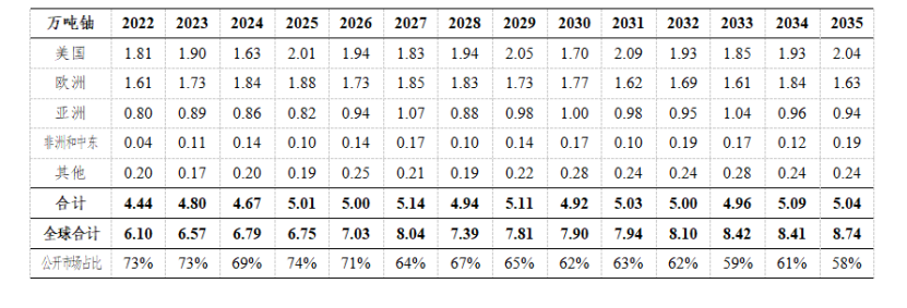 上表中的國家/地區占2022年全球鈾市場總需求的約73%。不過隨著中國、俄羅斯以及依賴中、俄設計的核電機組的國家持續發展核電,且一些公開市場的國家/地區核電裝機逐漸減少,預計到2030年左右,公開市場的鈾需求占全球份額將下降至62%,到2035年將進一步下降至58%(見下表)。