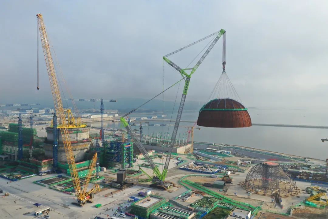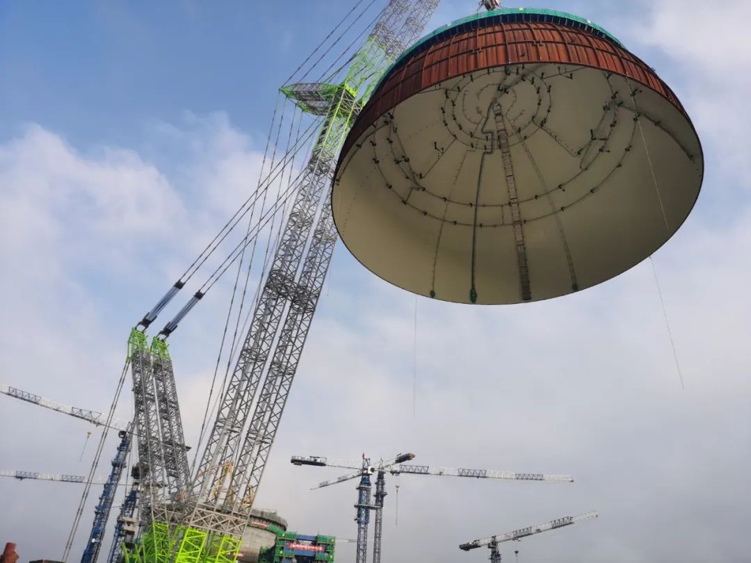 內穹頂吊裝是華龍一號核電工程建設的重要里程碑。穹頂位于核島頂部,主要功能是保證反應堆廠房完整性和密封性,對放射性包容起關鍵性作用。吊裝當天,隨著總指揮一聲令下,內穹頂被緩緩吊離地面,經過起鉤、變幅、提升、帶載行走、大臂逆時針回轉等一系列高精度動作,精準直達漳州核電2號機組反應堆廠房上方,隨后緩慢下降,經調整無誤后,平穩落鉤就位在安全殼鋼襯里上。