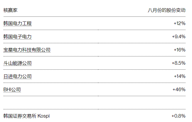 包括Kepco Engineering & Construction Co.和Korea Electronic Power Industrial Development Co.在內(nèi)的核反應(yīng)堆設(shè)備和部件供應(yīng)商上個(gè)月上漲了約10%。它們超過(guò)了該國(guó)基準(zhǔn)Kospi指數(shù)的漲幅,后者的漲幅不到1%。