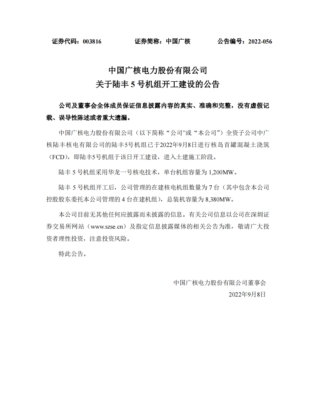 9月8日,中國廣核公告稱,全資子公司中廣核陸豐核電有限公司的陸豐5號機組已于2022年9月8日進行核島首罐混凝土澆筑(FCD),即陸豐5號機組于該日開工建設(shè),進入土建施工階段。