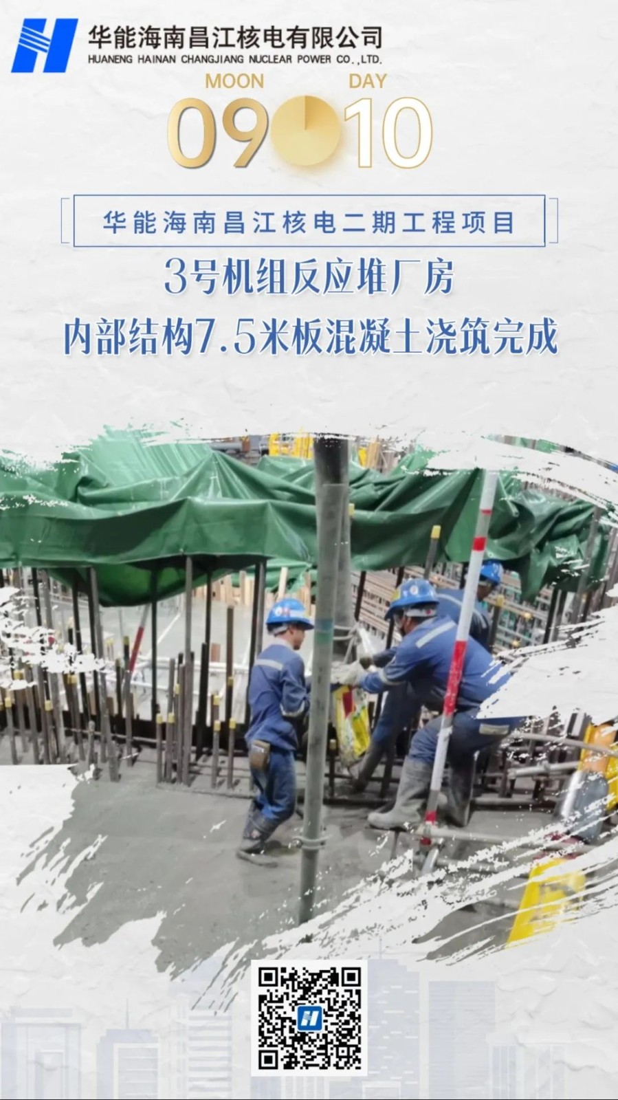 2022年,華能海南昌江核電3號機組反應堆廠房內部結構7.5米板混凝土澆筑完成,本層樓板分8段施工,共澆筑混凝土670立方米,持續澆筑時長30小時。本次澆筑完成后標志著3號機組反應堆廠房7.5米板圓滿完成。