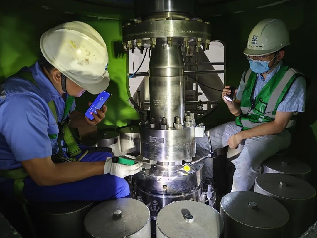 主泵全流量試驗通過模擬各種苛刻工況全面驗證主泵極限運行性能,2000余個零件的組裝精度直接關系運行表現,突擊隊在高標準完成泵芯和電機安裝的基礎上,堅持精益求精,反復優化,又經過3晝夜的調整驗證,將8.4米長的軸系的徑向跳動由要求值0.05mm降低至0.025mm以內,超標準完成軸系對中,確保廠內試驗將順利開始。