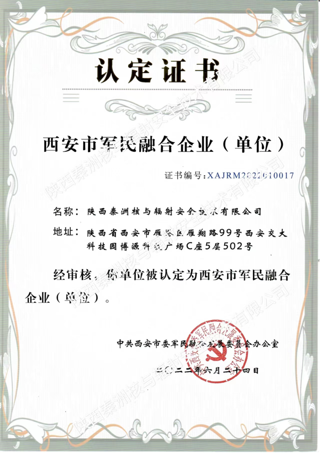 近日,西安市委軍民融合發展委員會公布了西安市2022年第一批軍民融合企業(單位)名單,中陜核集團核盛公司的控股子公司——陜西秦洲核與輻射安全技術有限公司(以下簡稱“秦洲公司”)被認定符合軍工產品配套類企業認定標準,列入2022年西安市軍民融合企業。