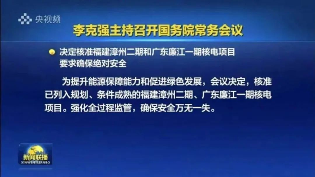 據9月14日新聞聯播報道,李克強主持召開國務院常務會議,為提升能源保障能力和促進綠色發展,會議決定,核準已列入規劃、條件成熟的福建漳州二期、廣東廉江一期核電項目。