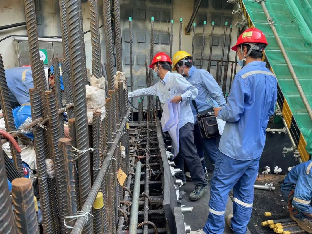 攻堅過程中,面對近期海南疫情防控的嚴峻壓力和臺風極端天氣影響,項目部領導班子及時召開專項工作會議,對防疫期間場內生產生活和場外人員居家辦公事項做了科學部署;通過對疫情情況的科學研判,在5號和1號門崗外建立集裝箱封閉管理中轉站,妥善解決了產業工人后續進場問題;施工現場采取分區管理制度——“7人一組”“4組一班”,確保了防疫措施有序落實的同時不延誤現場施工進度;項目部還與廠家保持密切溝通,及時解決了大宗材料進場壓車問題,保證了一線施工作業原料供應。