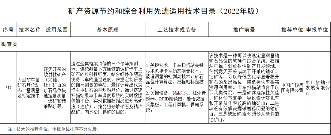 近期,自然資源部發布關于《礦產資源節約和綜合利用先進適用技術目錄》(2022年版)的公告(以下簡稱《目錄》),中廣核鈾業發展有限公司主持研發的“大型礦車鈾礦石品位動態定量測量及標定技術”成功入選該目錄,這是中廣核鈾業也是中國廣核集團首次入選。