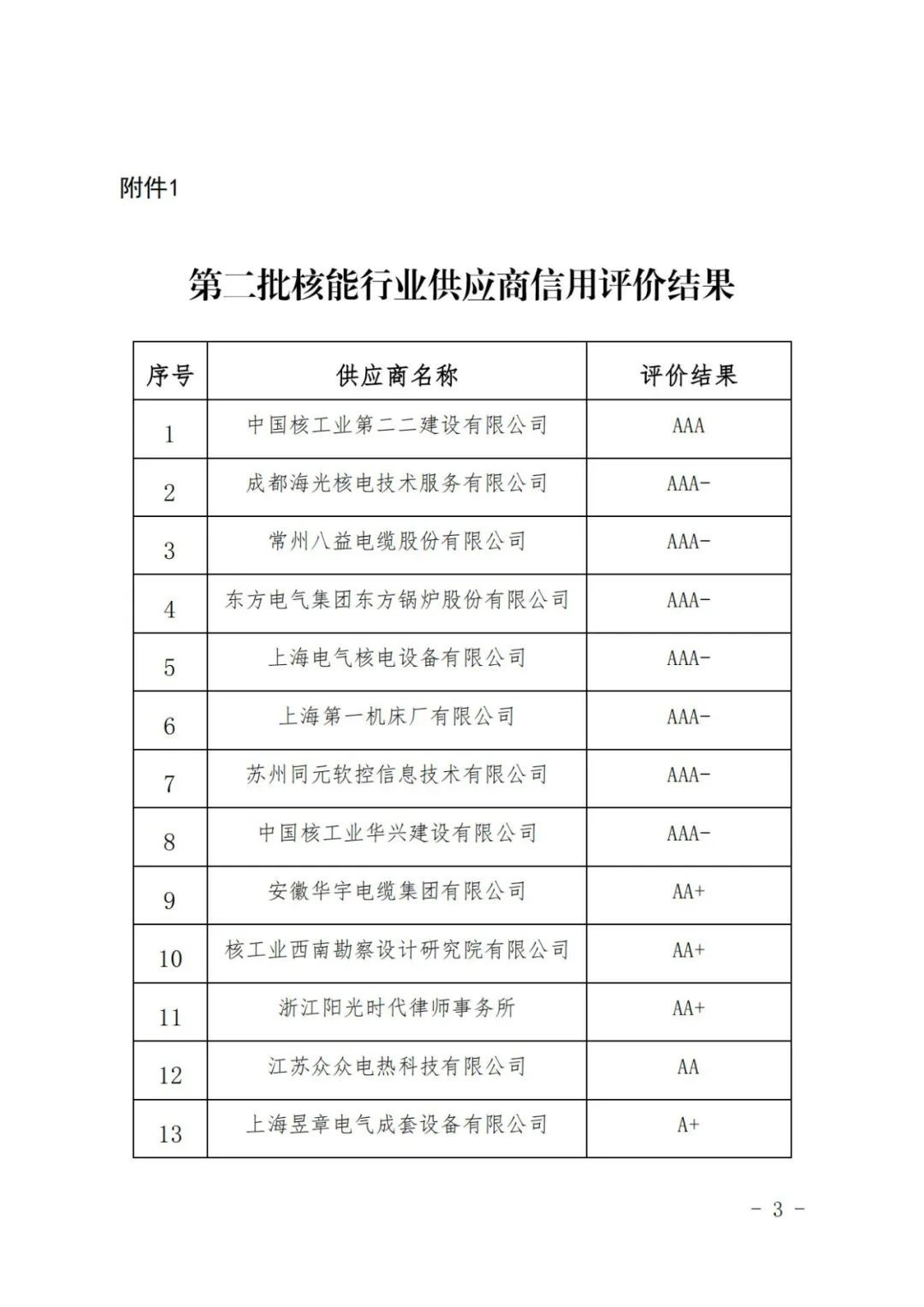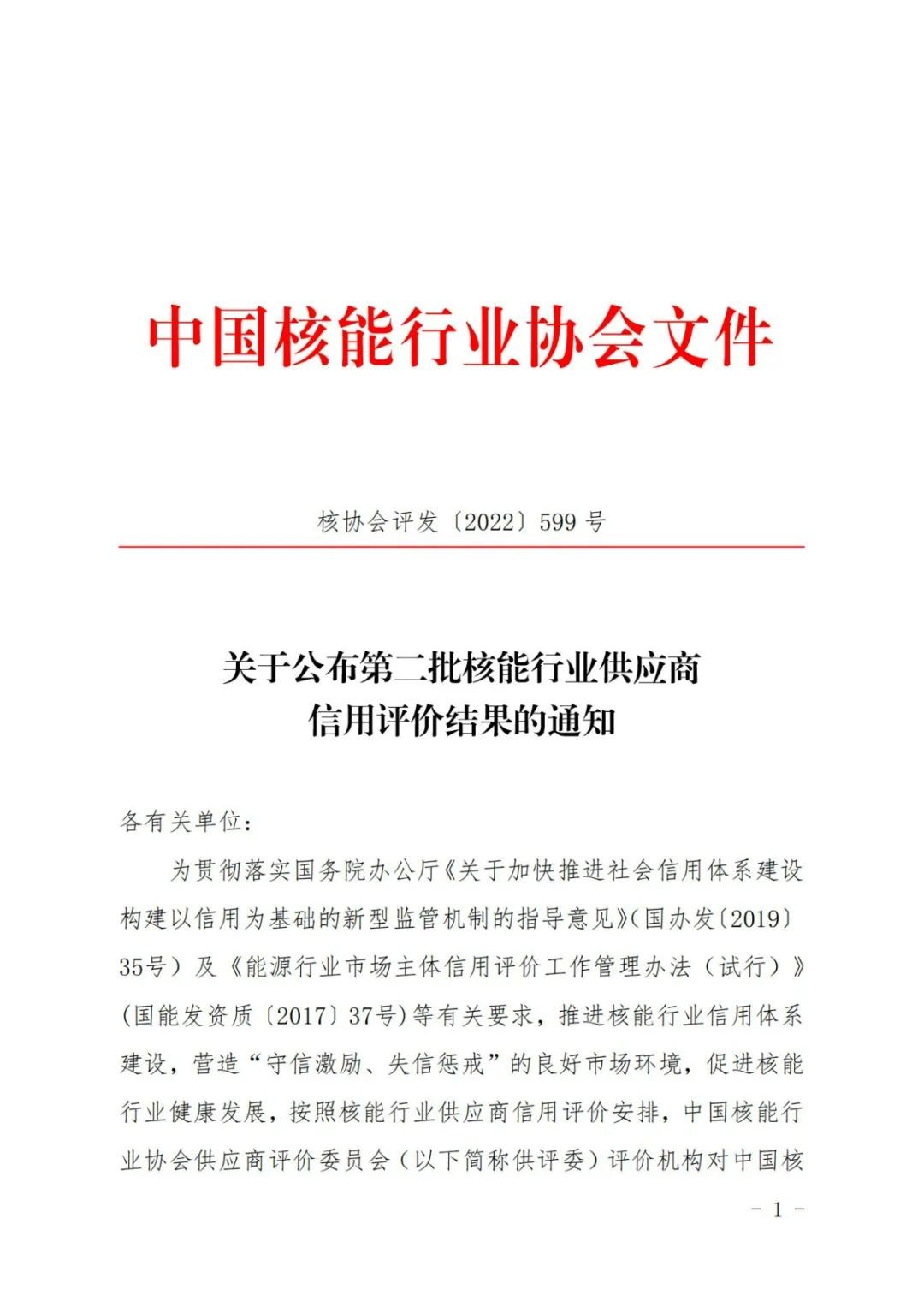 關于公布第二批核能行業供應商信用評價結果的通知