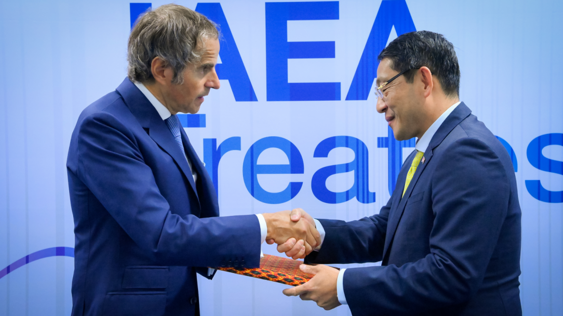 國際原子能機構(gòu)總干事拉斐爾·格羅西和柬埔寨王國礦業(yè)和能源部國務(wù)秘書翁英。(照片:D. Calma/IAEA)柬埔寨王國礦產(chǎn)和能源部國務(wù)秘書翁英交存了《核事故或輻射緊急情況援助公約》的加入書。