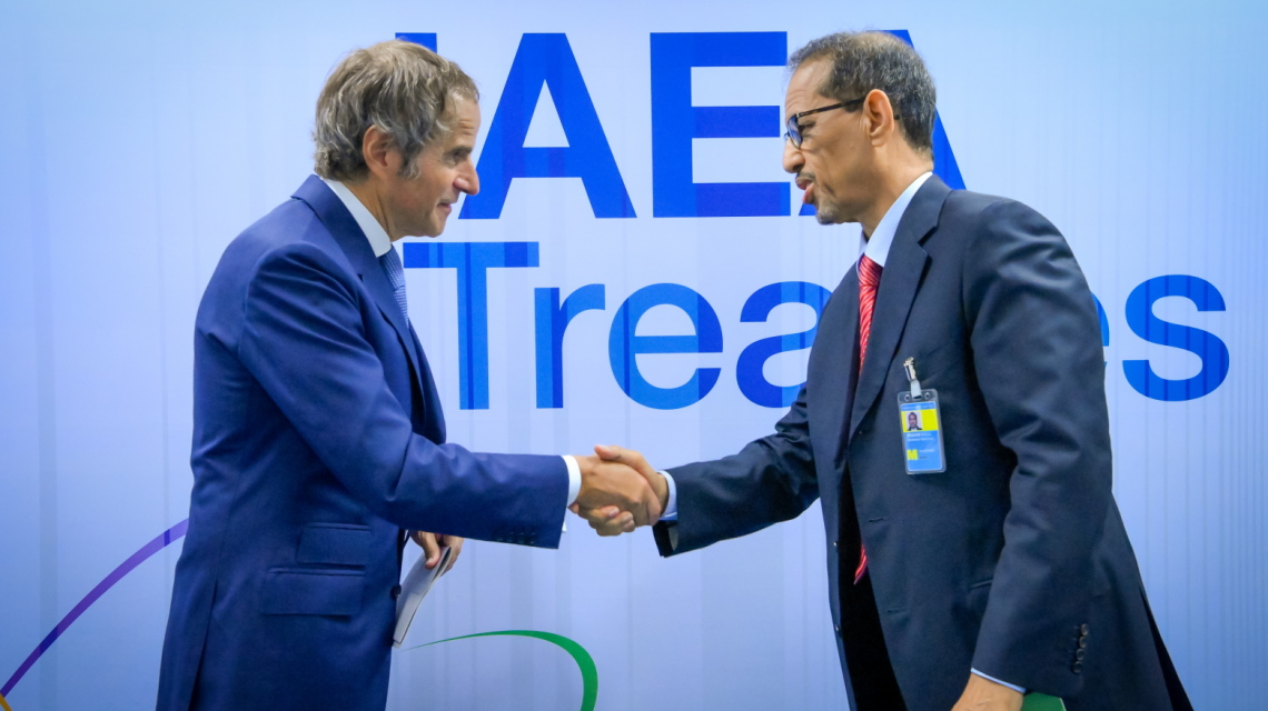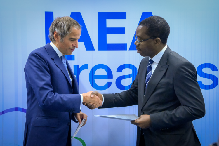 國際原子能機構(gòu)總干事拉斐爾·格羅西和毛里塔尼亞大使穆罕默德·馬哈茂德·布拉欣·哈利勒。(照片:D. Calma/IAEA)毛里塔尼亞大使 Mohamed Mahmoud Brahim Khlil 交存了一份接受《非洲核科學(xué)技術(shù)研究、發(fā)展和培訓(xùn)地區(qū)合作協(xié)定》(AFRA)的文書。