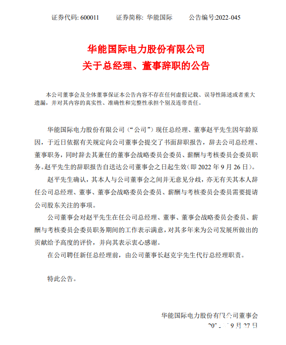 9月27日,華能國際發布關于總經理、董事辭職的公告。華能國際現任總經理、董事趙平先生因年齡原因,于近日依據有關規定向公司董事會提交了書面辭職報告,辭去公司總經理、董事職務,同時辭去其兼任的董事會戰略委員會委員、薪酬與考核委員會委員職務。趙平先生的辭職報告自送達公司董事會之日起生效(即2022年9月26日)。