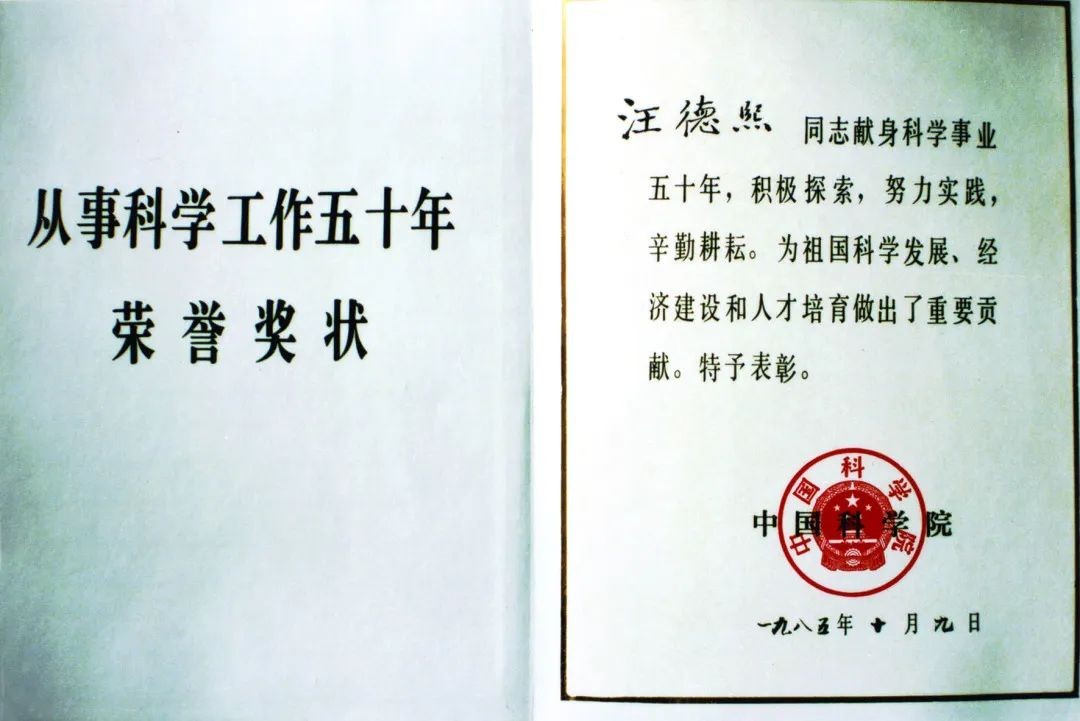 1985年,中國科學院向汪德熙頒發從事科學工作50年榮譽獎狀