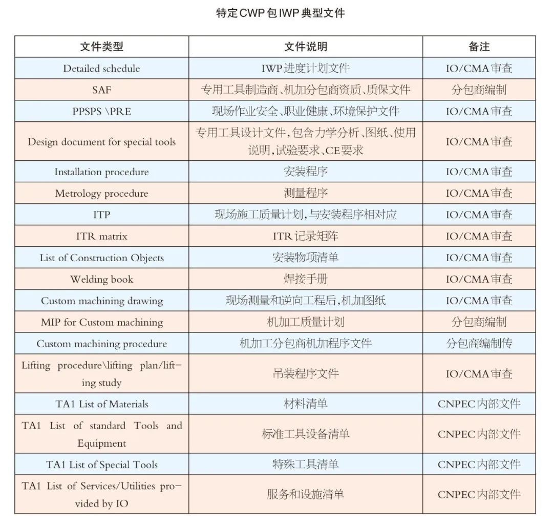 特定CWP包IWP典型文件是每個(gè)CWP包都需要的內(nèi)容,直接指導(dǎo)現(xiàn)場(chǎng)施工活動(dòng)的程序,包括專用工具加工制造圖紙、計(jì)算報(bào)告,安裝程序;測(cè)量程序,吊裝程序(計(jì)劃),機(jī)加圖紙,現(xiàn)場(chǎng)服務(wù)商分包作業(yè)程序等。