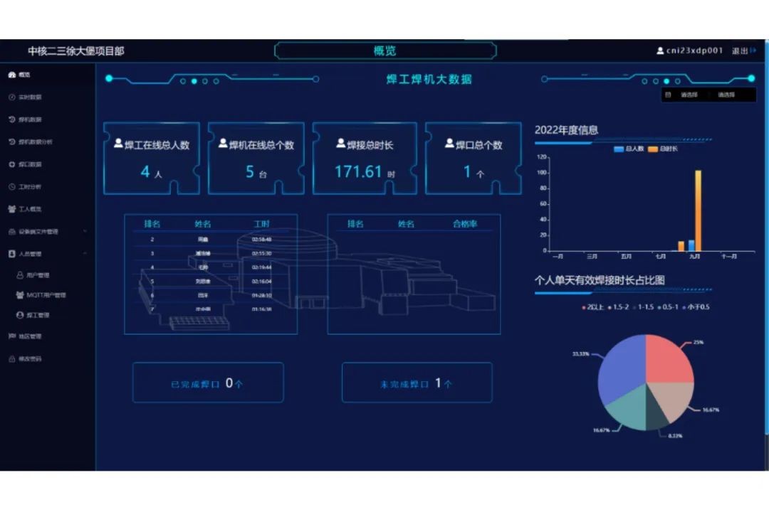 圍繞焊接過程的精細化管理,全面推進焊接物聯網系統的應用,目前已有19臺數字化智能焊機全部投入使用。為完成焊接物聯網系統的全面運行應用,積極在焊工培訓及管道支架預制車間內試運行,焊工使用數字化智能焊機進行刷卡、焊接,組織技術人員在焊接物聯網系統可視化概覽界面中,對焊工的焊接工時進行統計,進一步提升焊工的焊接工時及焊接效率,實現焊接工藝的智能化控制。