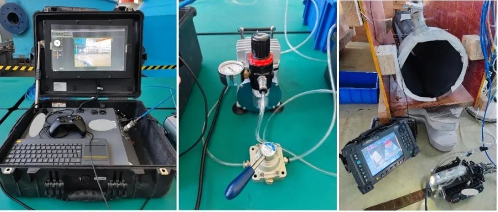 機器人進行工作需要先后克服通過閥門、狹長的管道、猶如大“陷阱”的三通開口以及喉管部位需爬坡等困難,而在閥門解體后項目組還碰到了管道殘水等挑戰,項目主管張帥立即組織項目組審慎決策、科學求證及實操模擬,最終掃清一切障礙,機器人經過“跋山涉水”成功開展遠程測厚。