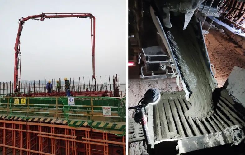 2021年12月31日,示范項目選擇北護岸三段B-15沉箱作為鐵鋁酸鹽水泥混凝土首次澆筑的永久構件,單件方量達574.52m³,混凝土強度等級為C40。首次澆筑一次性取得成功。